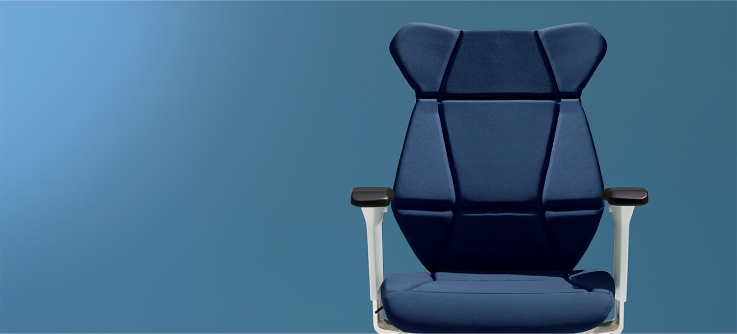 折り目のついた背もたれが身体の動きにしなやかに追従、集中したいときの姿勢、リラックスしたいときの姿勢と、座る人の様々な動きに柔軟に寄り添うイスだ。