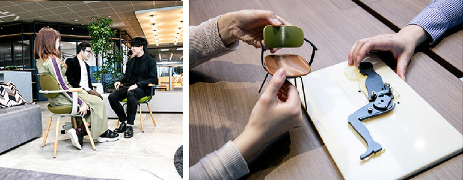 イトーキと柴田氏でディスカッションを重ね、コンセプトが決まった。それは“「働く」と「暮らす」を越境するワークチェア“。このコンセプトを実現するための、量産設計担当として選ばれたのが、高橋・竹谷・森田という入社10年目以内の若いチームだ。3人は「月曜日の朝から金曜日の夜まで、ほとんど滋賀に“住み込み”でしたね」と笑う。設計テーマリーダーである高橋と構想設計・詳細設計を担う竹谷は東京在住。2人は滋賀の森田の寮で、昼夜を問わず議論を重ねた。